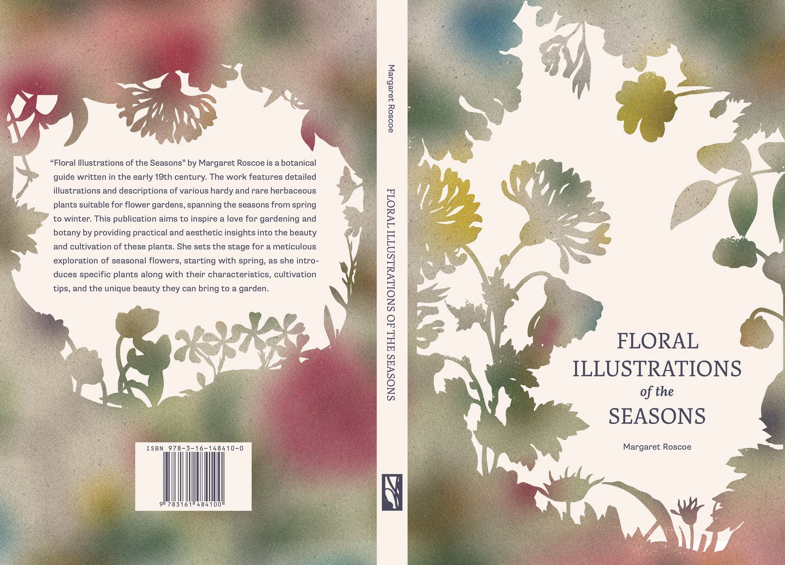 After plenty of waffling between texts, I decided on the Floral Illustrations of Seasons because of its delicious illustrations, dramatic type, and great type-setting opportunities. In doing a little research on how the illustrations were prepared, I learned about the aquatint printing process, in which copper plates were etched, inked, and printed. Roscoe would later use watercolor to render the flowers further. Considering that materiality, I created illustrations for the cover and chapter openers that reference watercolor blotches and washes. Cut into these washes of color are silhouettes of flowers. On the cover, the cutouts hug the book’s title, creating floral portals into the text beneath.